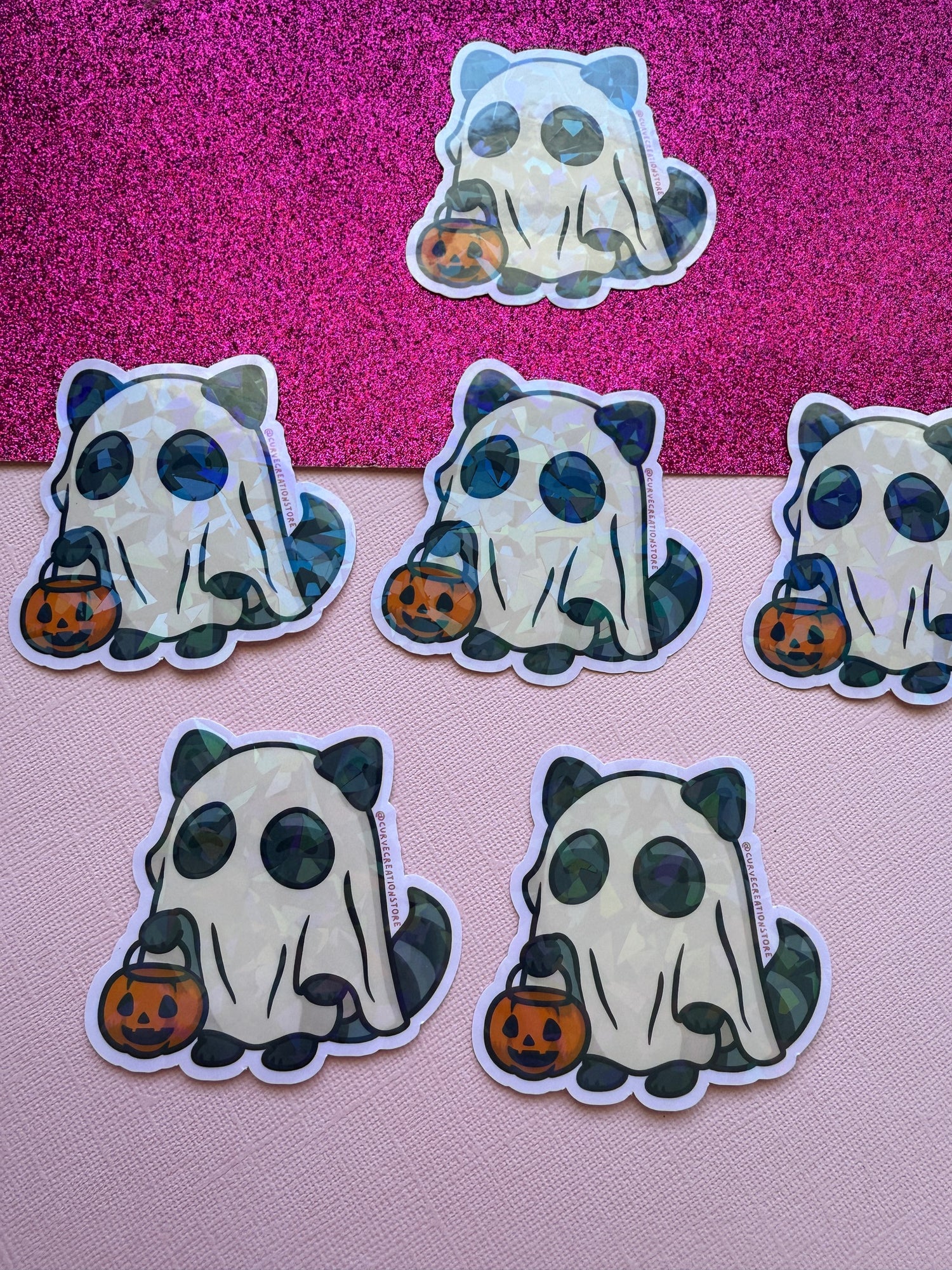 this month's freebie sticker is brought to you by Halloween! It features my Neurodivergent raccoon dressed as a sheet ghose for trick-or-treating