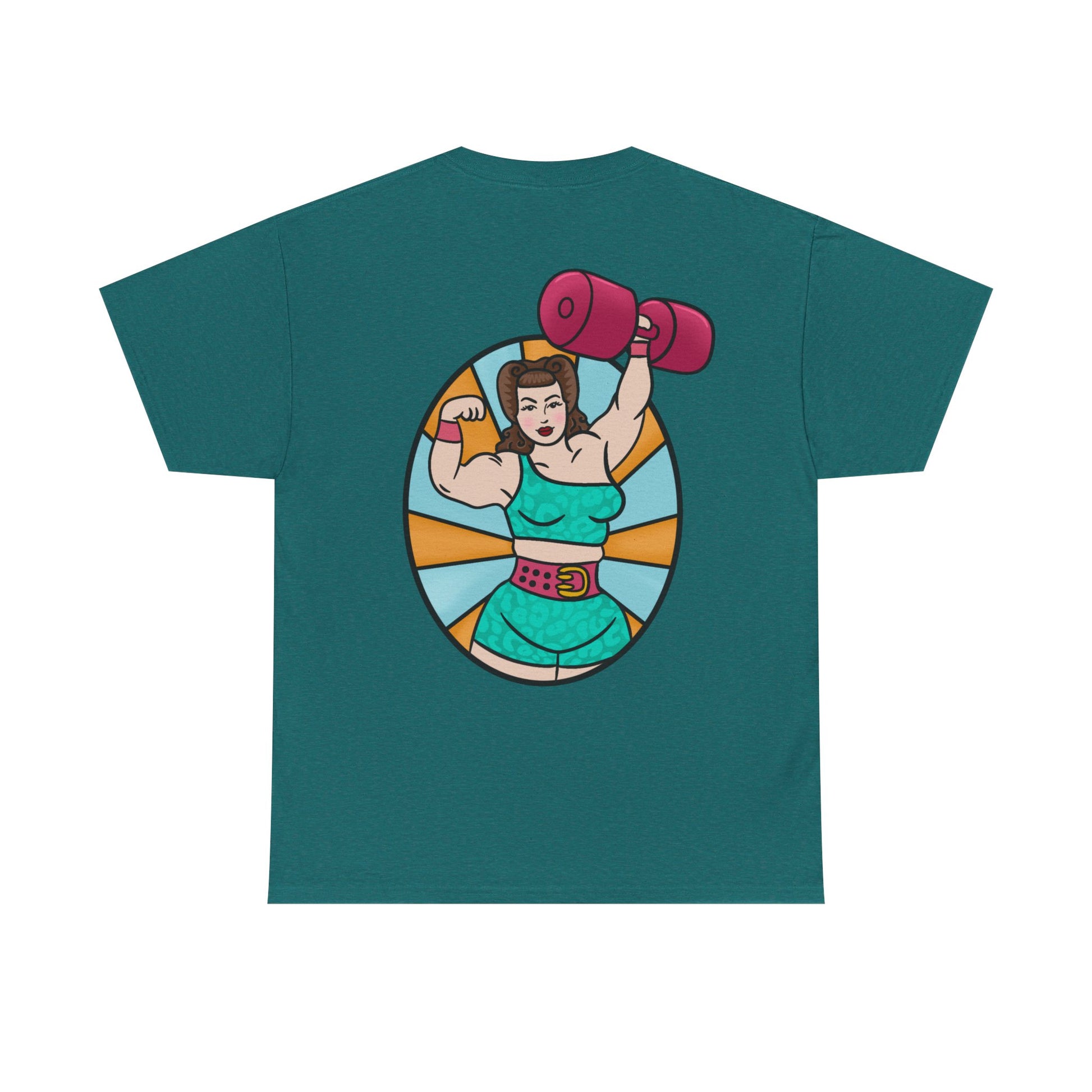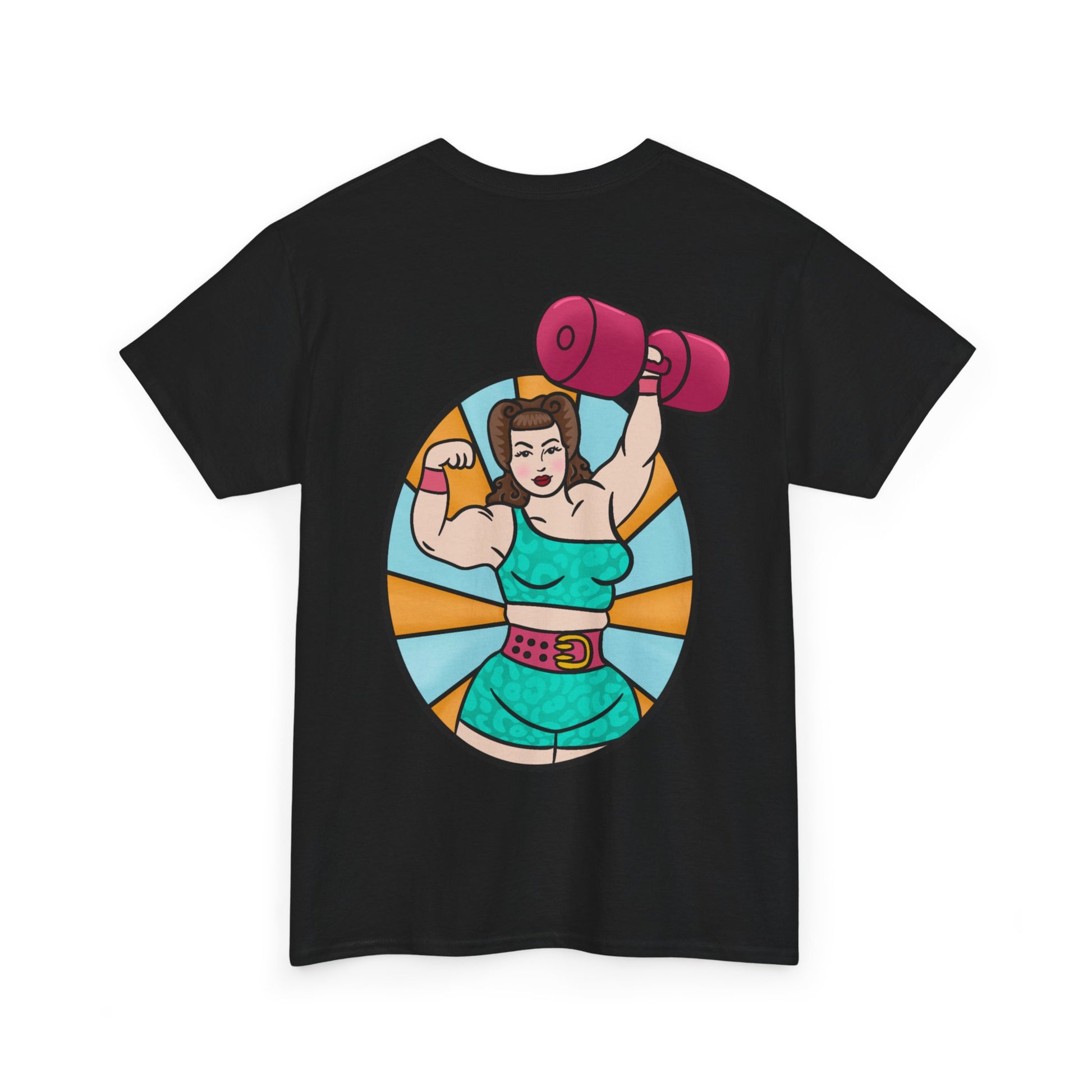 Channel your inner powerhouse with this tee featuring a retro-inspired strongwoman pressing a monster dumbbell like it's no big deal. Built from the same fire that fuels your first comp nerves, lifting PRs, and the kind of grit that doesn’t come from the gym—it comes from within.