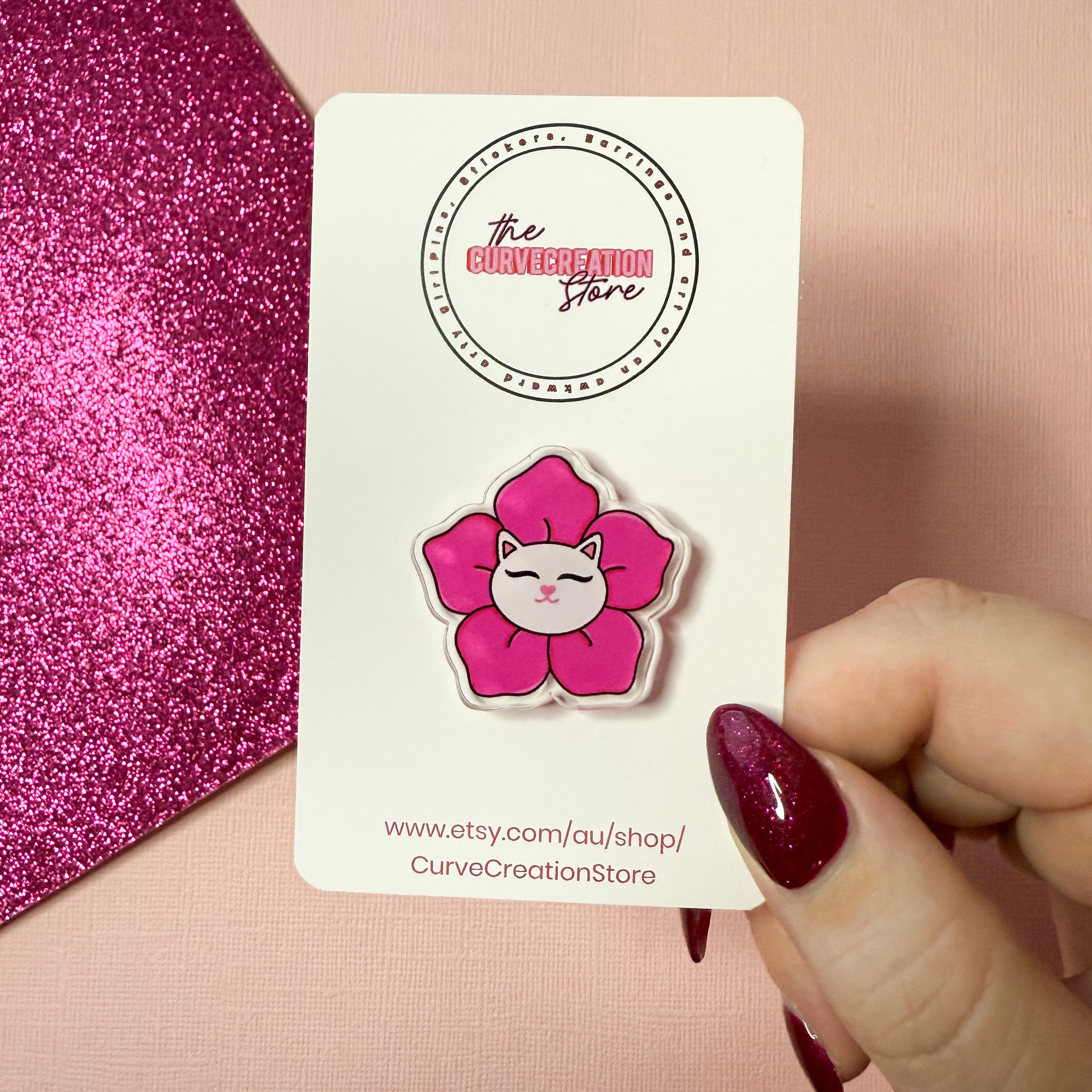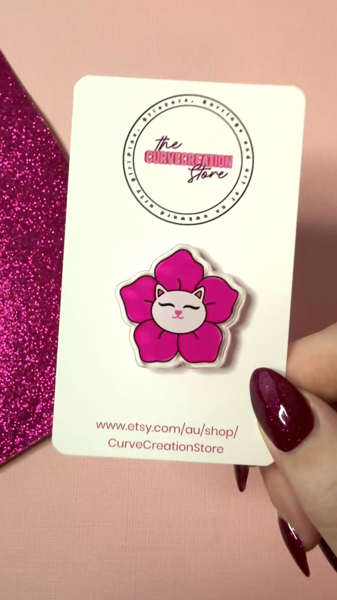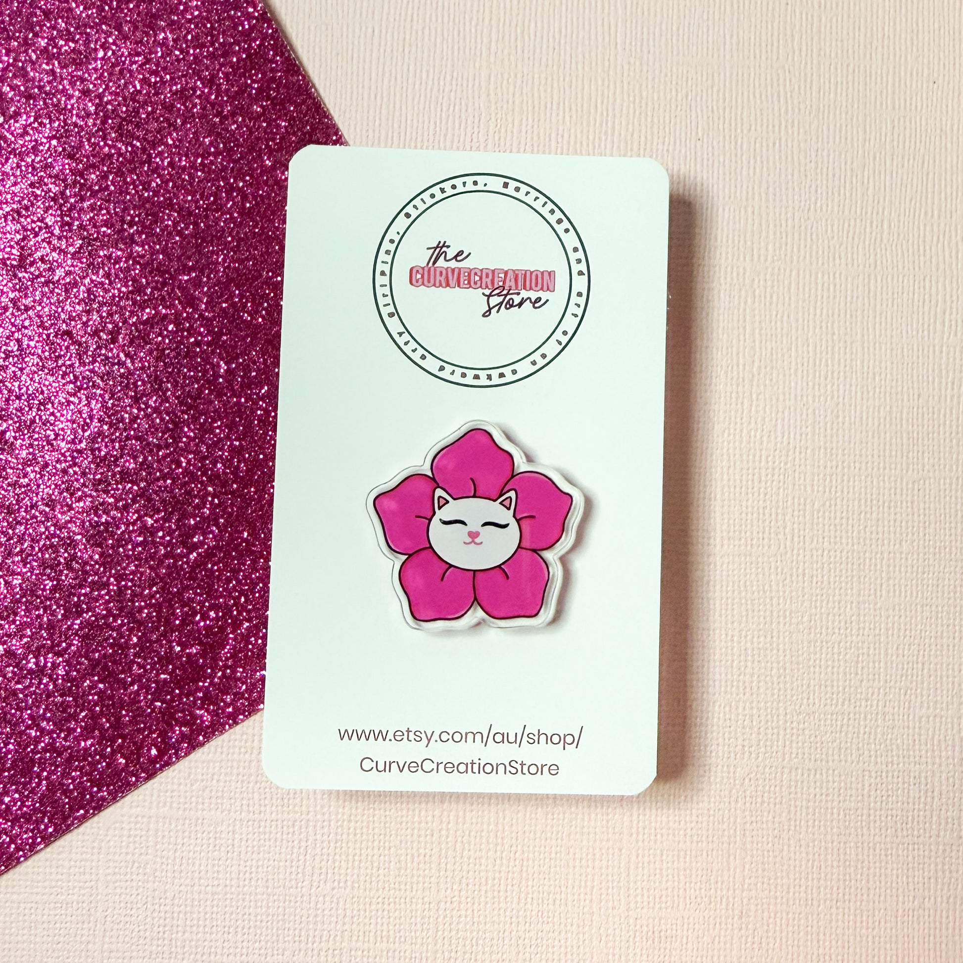 This little white cat peeks out from a gentle pink blossom, bringing quiet joy and pastel charm to your pin collection.